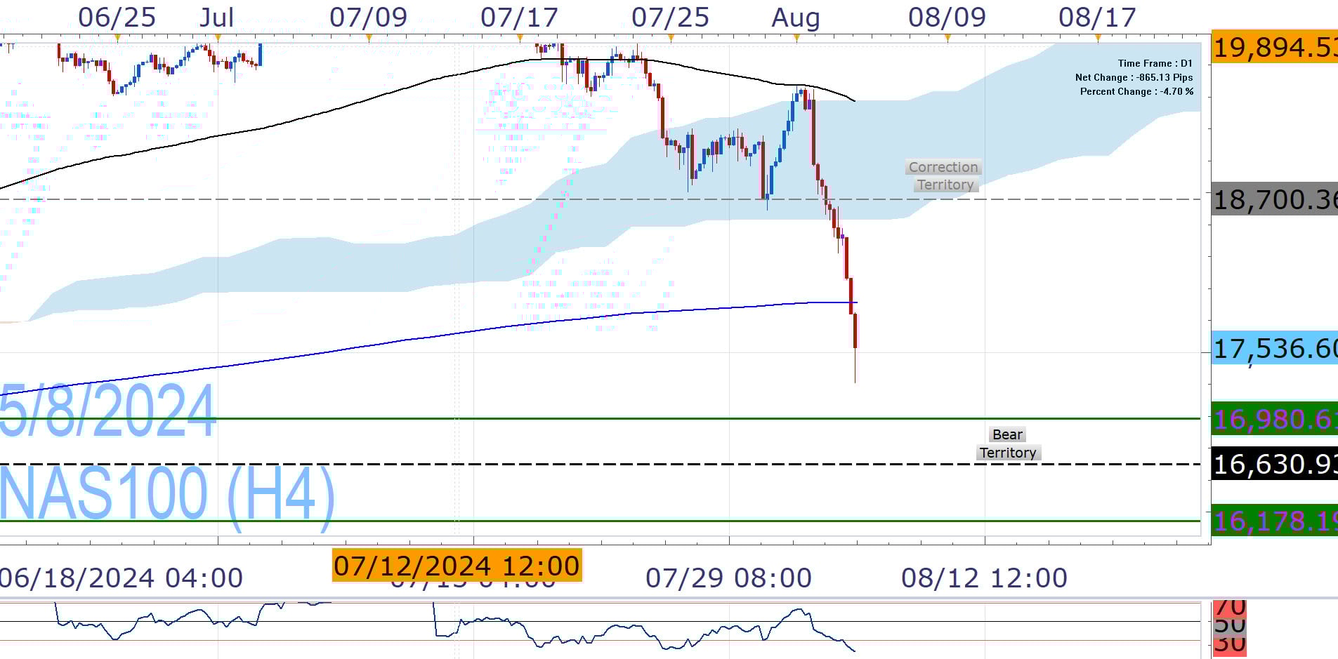 In the meantime, the Fed had opened the door to a pivot [4], but that offered only brief respite and NAS100 went into Friday's critical employment report form a weak position. The results were below expectations, with the creation of just 114K jobs in July, the worst print since the pandemic year. Unemployment jumped to 4.3% y/y and the highest in nearly three years. The results exacerbated worries that the Fed is behind the curve, stoked recession fears and bolstered calls for aggressive rate cuts. Markets now price in 125 basis points of cuts in the three remainder meetings of the year (from 75 bps previously), according to CME's FedWatch Tool.[5]