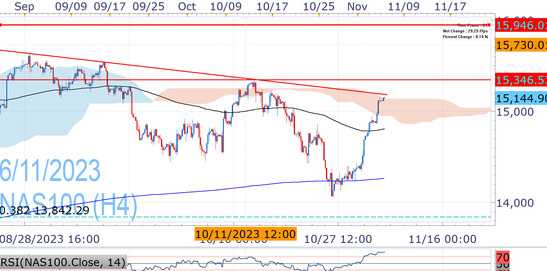 The Federal Reserve delivered its second rate hold in a row and adopted a less aggressive stance than previously. Two days later, the jobs report showed the addition of just 150,000 payrolls in October and an uptick in unemployment, to 3.9%. These events reinforced market expectations that rates have already peaked and sent NAS100 to a relief rally and its best week since March 2022.