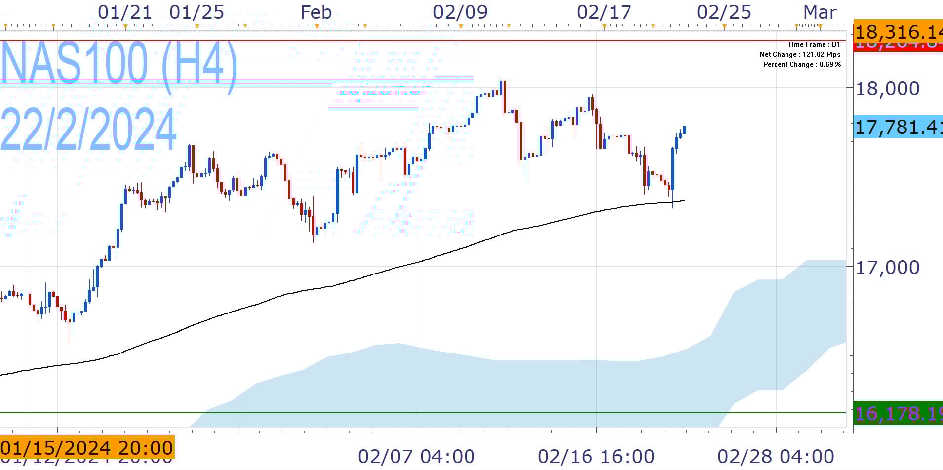 NAS100 has shown resilience and lools past the hawkish FOMC minutes, focusing on Nvidia's blockbuster results. These helped it defend the EMA200, which keeps it on track for new all-time highs (18,053).