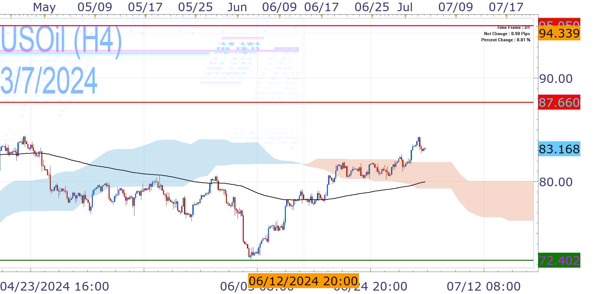 USOil made a strong finish to a losing second quarter, staying in profitable territory for the year. The commodity runs its fourth straight profitable week and the longest streak of 2024, hitting the highest levels in nearly three months. The resurgence brings the 2024 highs in the spotlight (87.66), but we are cautious around further strength.