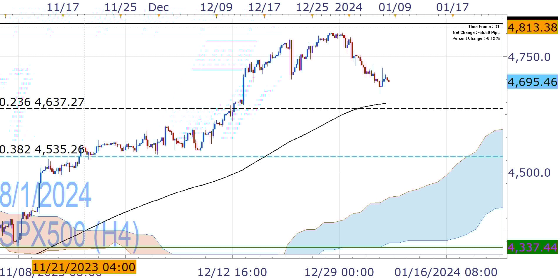 Friday's NFPs may have cooled down a bit the market pricing for rate cuts by the Fed, but CME's FedWatch Tool still assign the highest probability for this process to start in March and send rates 150 basis points lower by the end of the year [2]. SPX500 is cautious, bit above the EMA200 the upside momentum is intact and has the ability to set new all-time highs (4,820).
