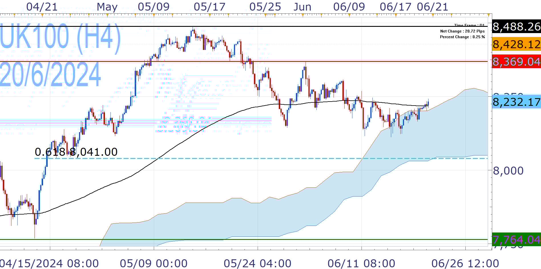 UK100 found support by the daily Ichimoku Cloud and reclaims the EMA200 (black line), This gives it the opportunity to set new June highs (8,369) and push for new records.