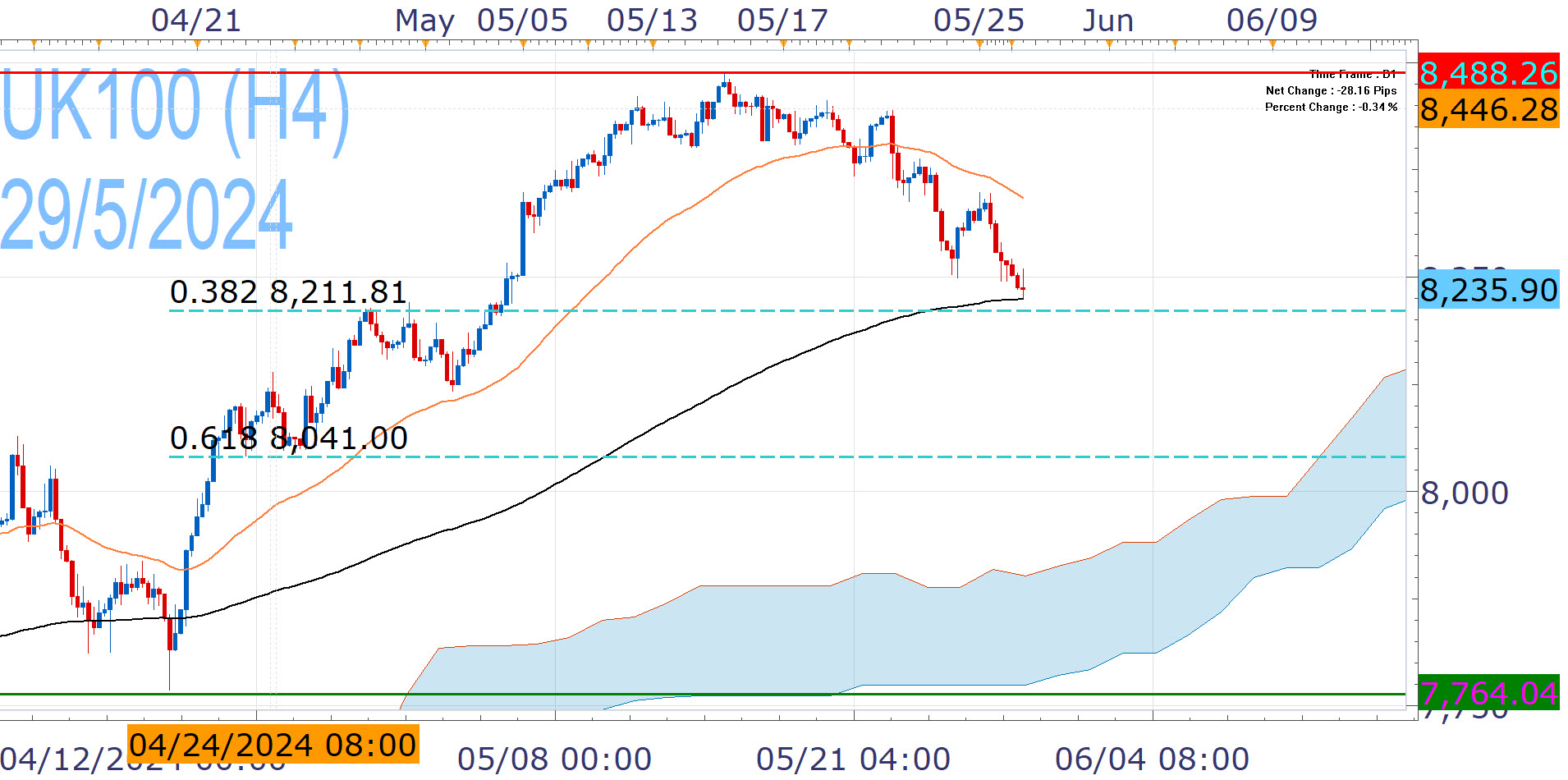 The pushback in expectations around the timing of the fist BoE cut and election uncertainty, along with technical factors have led to a UK100 pullback to pivotal levels. It tests the EMA200 and the 38.2% Fibonacci of the last leg up (form April low). Daily closes below it would pause the bullish bias and open the door to further losses toward the daily Ichimoku Cloud.