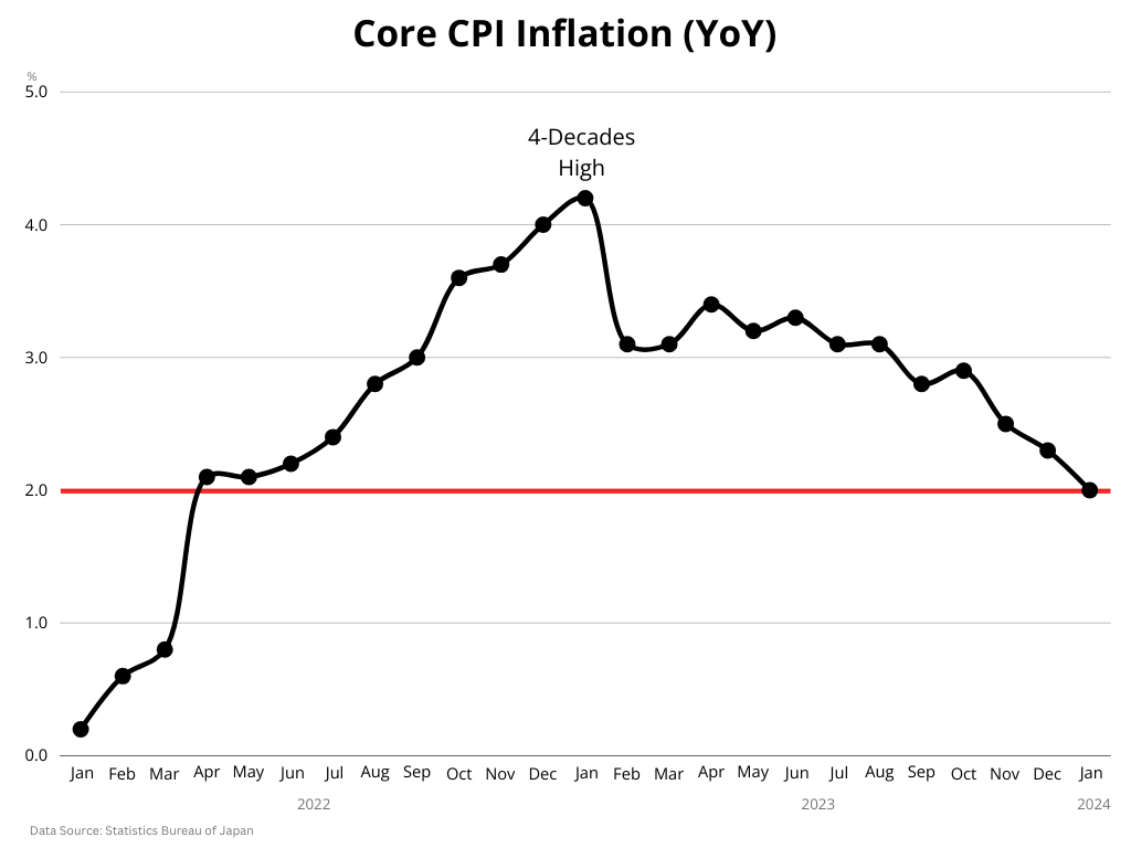 Today's data showed further deceleration in Japan's inflation (ex-fresh food), but at 2% y/y it was hotter than anticipated. Furthermore, it stayed above the central bank's 2% target for nearly two years, which forecasts it at a median of 2.4% for the next fiscal year (starting in April).