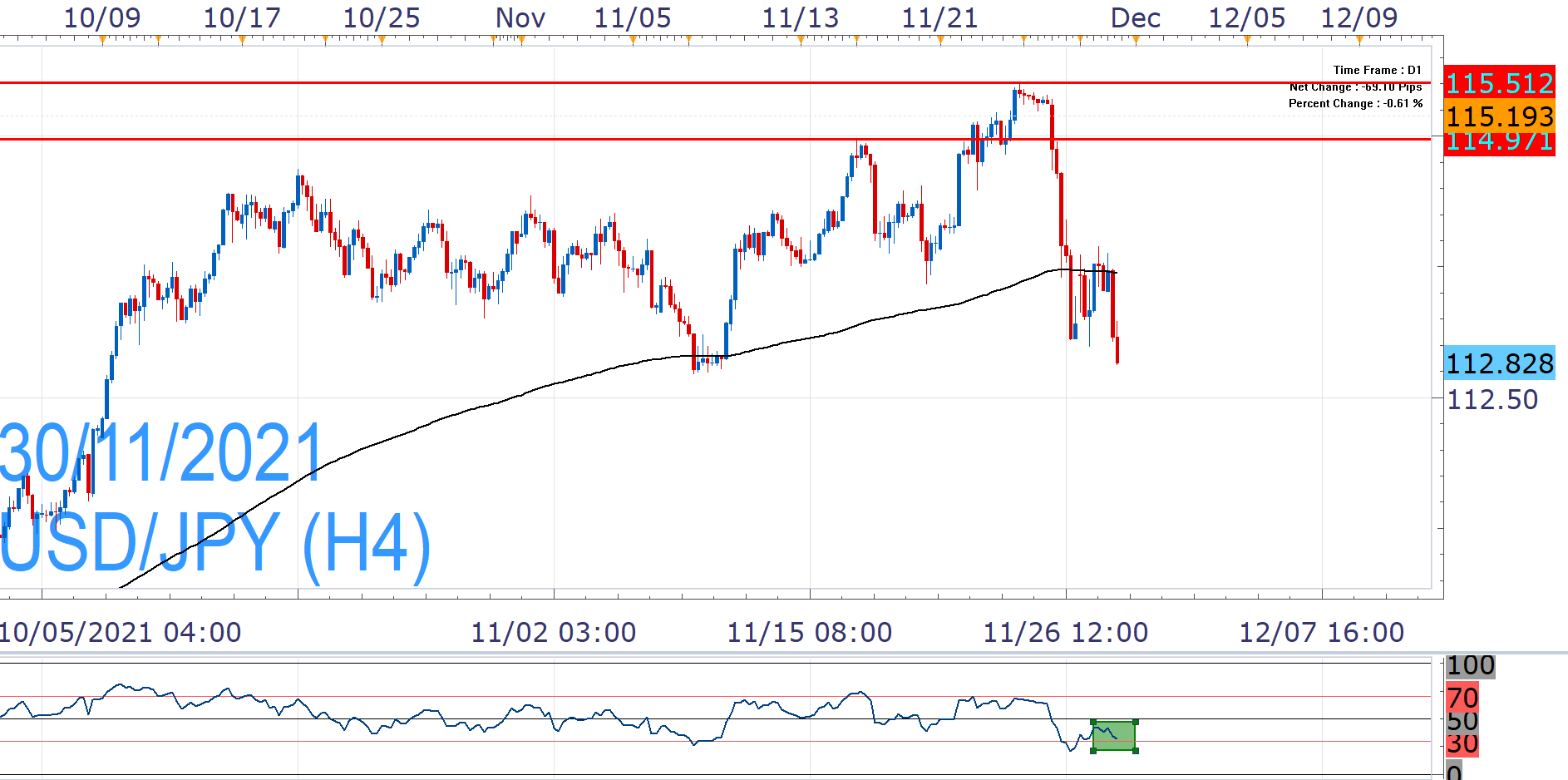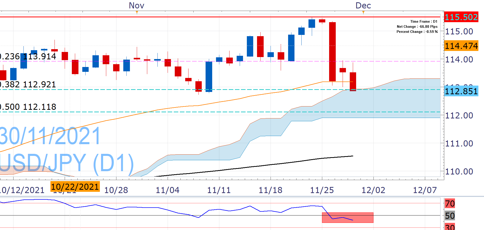 As such, USD/JPY takes another plunge today - following its worst day since the start of the pandemic – that brings it at an important technical juncture. It has two daily closes well below the 23.6% Fibonacci of the "August Low/November multi-year High" advance (113.91) and now probes the next level at (112.92-71), which also includes the upper border of the Ichimoku Cloud.