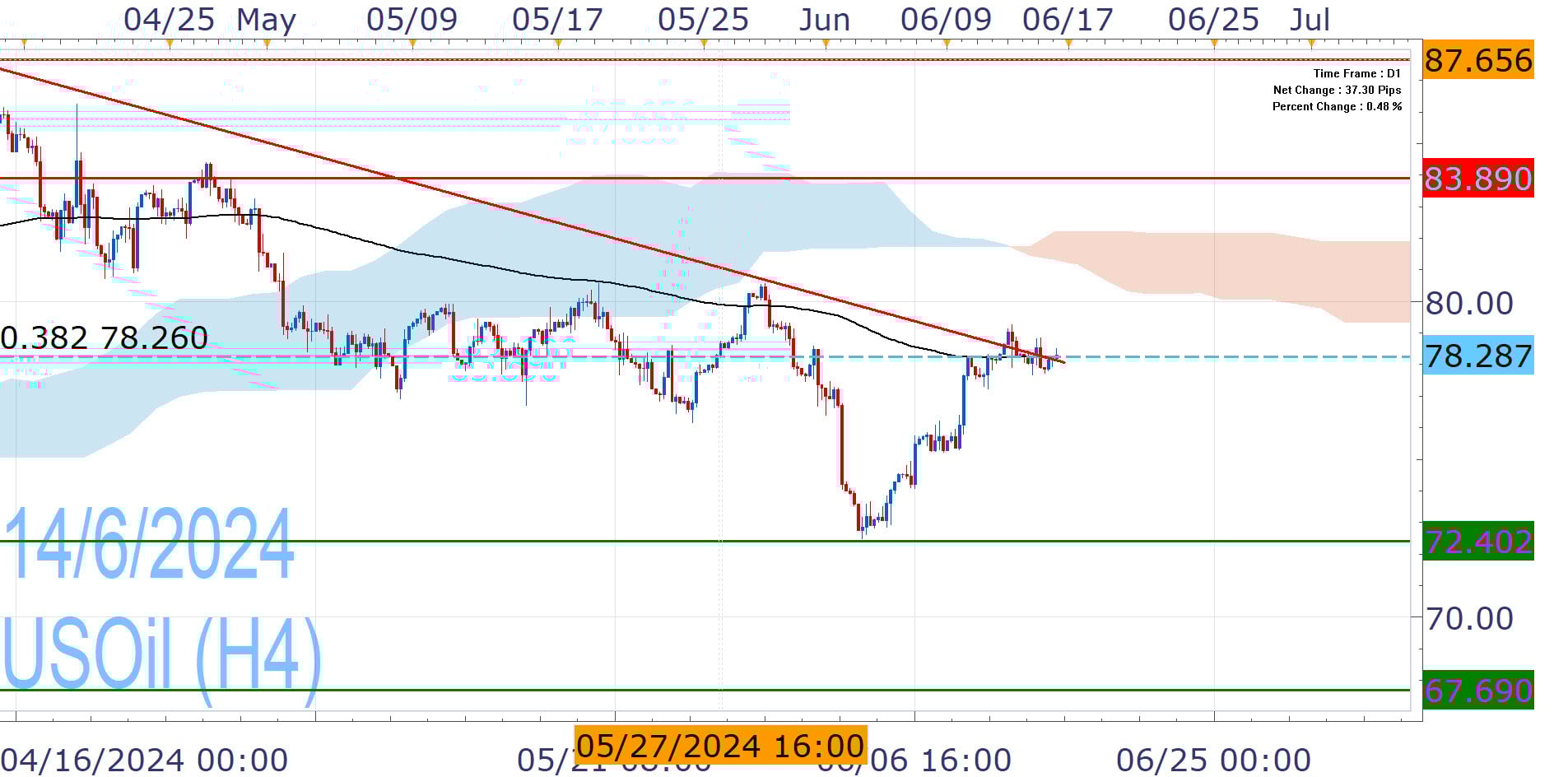 USOil was able to look past the negativity and head towards the conclusion of a profitable week. It tries to take out a crucial technical cluster, consisting of the 38.2% Fibonacci of the recent drop, the EMA200 and the descending trend line of the 2024 highs. Successful effort will pause the bearish bias and allow the commodity to look towards 83.89.