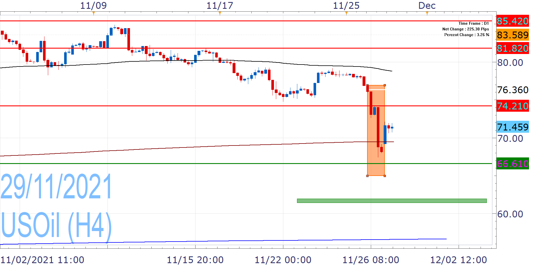 Caution is required regarding USOil's next leg, since Friday's move came in the midst of the US Thanksgiving Holiday and information regarding the new Covid-19 variant are still sparse. Furthermore, OPEC and allies - a group that has come to be known as OPEC+ - are expected to meet later in the week, to discuss production output, in the aftermath of US decision to release oil from its strategic reserves.