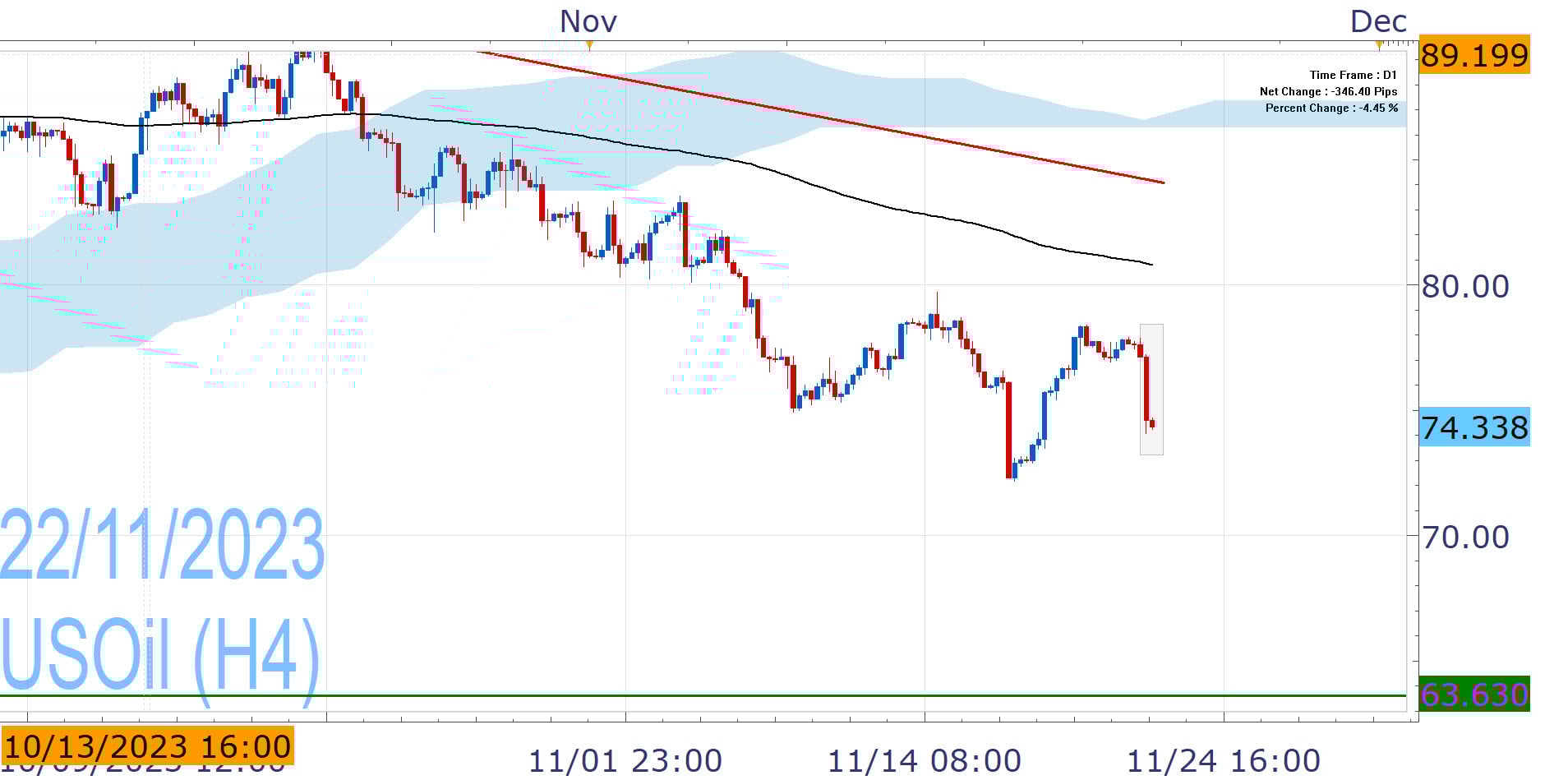The conference was scheduled for the weekend, but the organization pushed it back for Thursday 30 November. This is not a good sign for prospects of more output curbs, as it may be an indication of disagreements amongst members around production. OPEC and its allies have implemented massive supply cuts, but there seems to be some dissatisfaction in regards to the contribution of some members. The policy has failed to support prices recently, which have been falling after September peak, so participants may need to further restrict supply. The International Energy Agency (IEA) warned last week that the market "could shift into surplus at the start of 2024". [2]