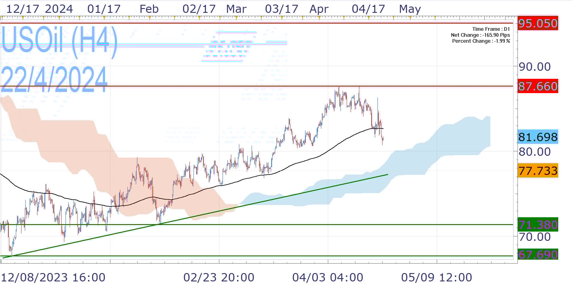 USOil slides below its EMA200 that halts the recent bullish bias. This exposes the commodity to the daily Ichimoku Cloud and the ascending trend line from last year's lows. The region can provide support and weakness below it has a higher degree of difficulty. On the other hand, Middle East tension are unlikely to go away and any escalation could send prices higher. As such new 2024 highs (87.66) cannot be ruled out, but prolonged gains past that would likely need actual supply disruptions.